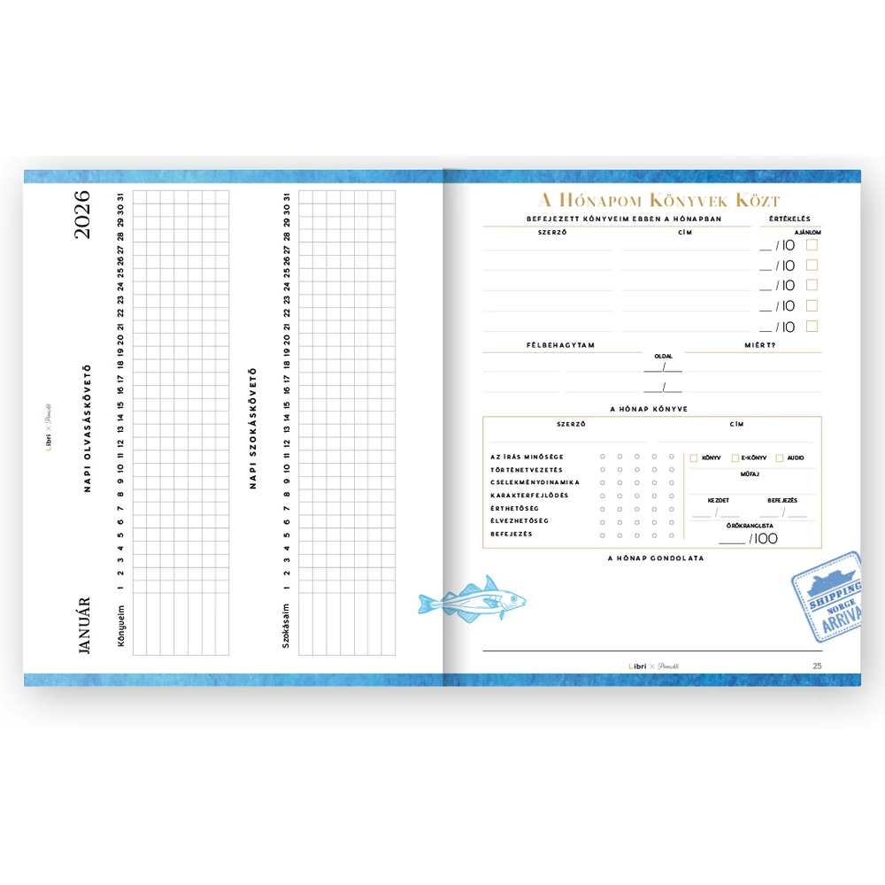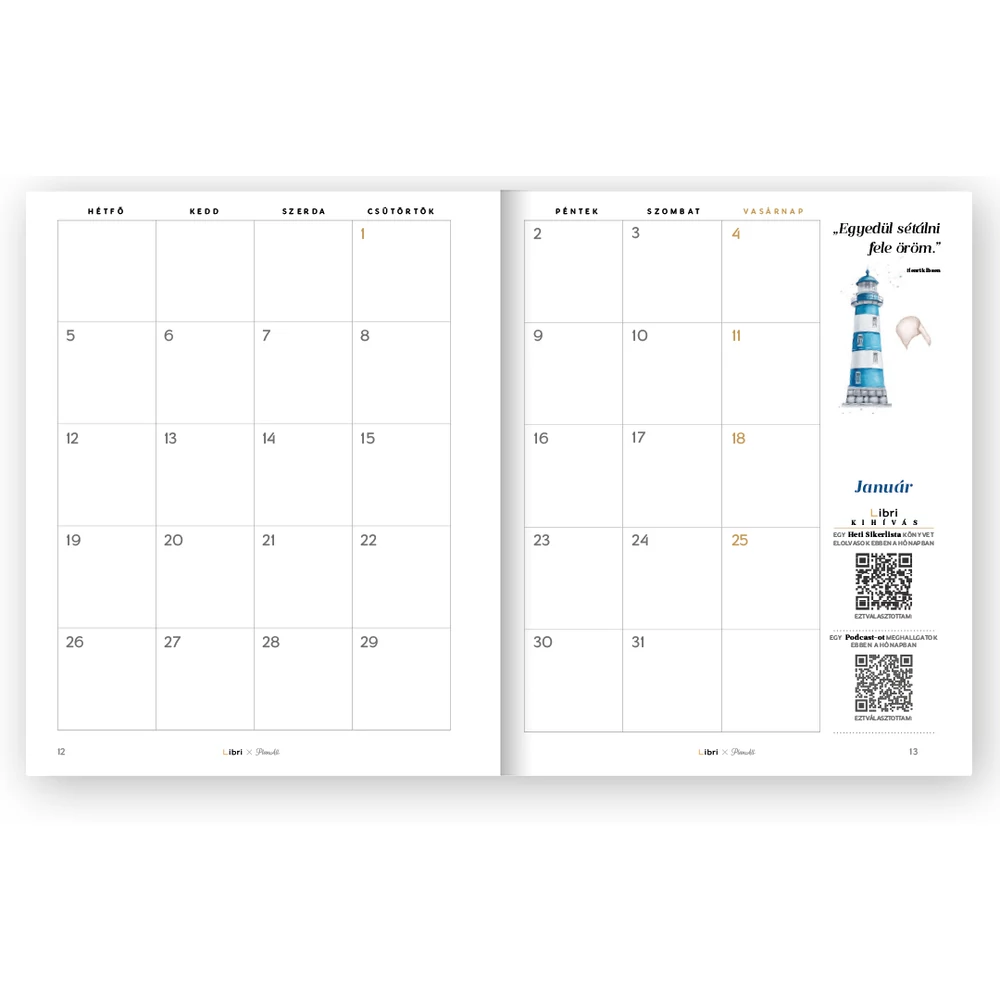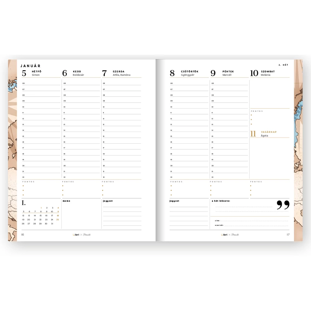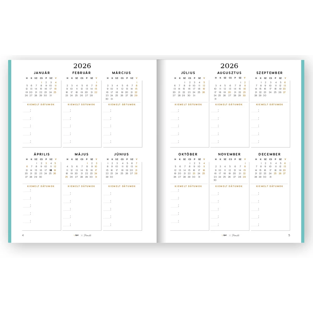 A 2026-os esztendőt is a PlanAll és a Libri közös határidőnaplójával ünnepelhetjük! Amellett, hogy segít a napi és heti teendők hatékony megtervezésében, interaktív olvasónaplóként is funkcionál. Havi összesítők, kívánságlista, könyvbingó – mindegyik kihívás arra ösztönöz minket, hogy tudatosabban rendszerezzük az elolvasni kívánt könyveinket, illetve, hogy a tartalmakban gazdag élményeinket a lehető legátláthatóbban kategorizáljuk. A kiadvány izgalmas sajátossága, hogy bemutatja a különféle országok földrajzi és irodalmi kuriózumait is. A lapokon keresztül eljuthatunk Norvégiától egészen Kolumbiáig, eközben pedig informatív képet kaphatunk a minket körülvevő régiók kulturális sokszínűségéről.
